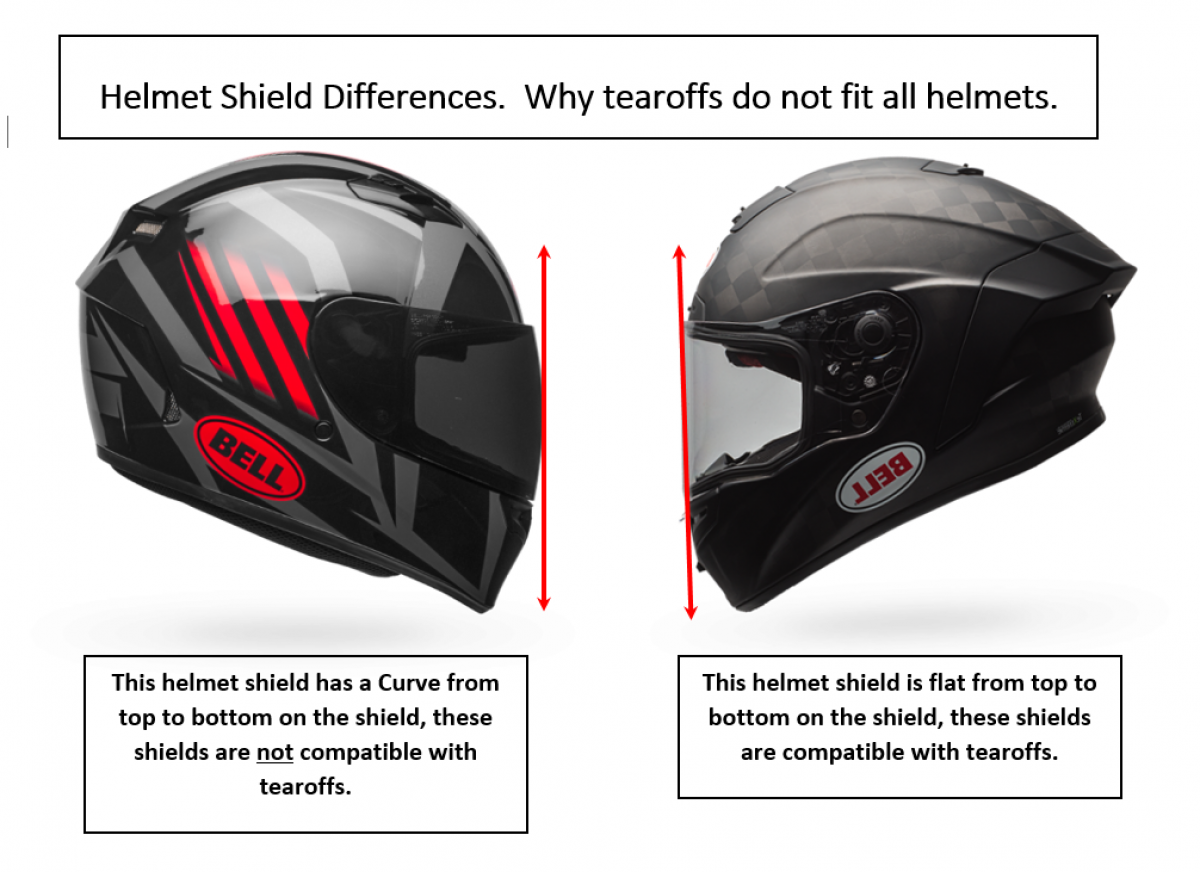 ATTENTION: Some Helmets come with a shield that has a curve from the top to the bottom, this can be seen when viewing the helmet from the side view. Shields with this curve cannot use tearoffs, you will need the shield that is flat from top to bottom for the tearoffs to fit correctly. These shields are available through Bell or their Distributors.